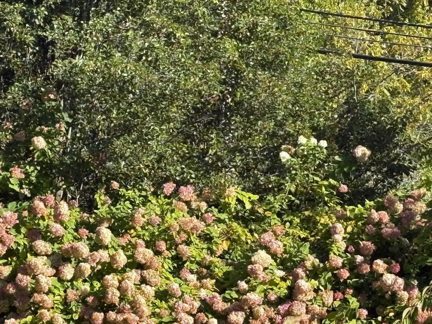 The last vanilla hydrangeas blossoming in the sun among their strawberry creamcicle cousins.